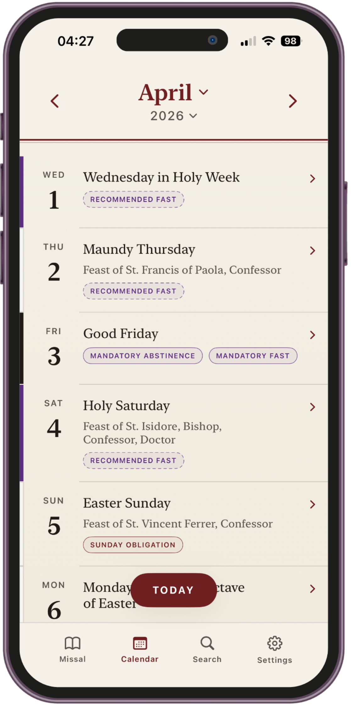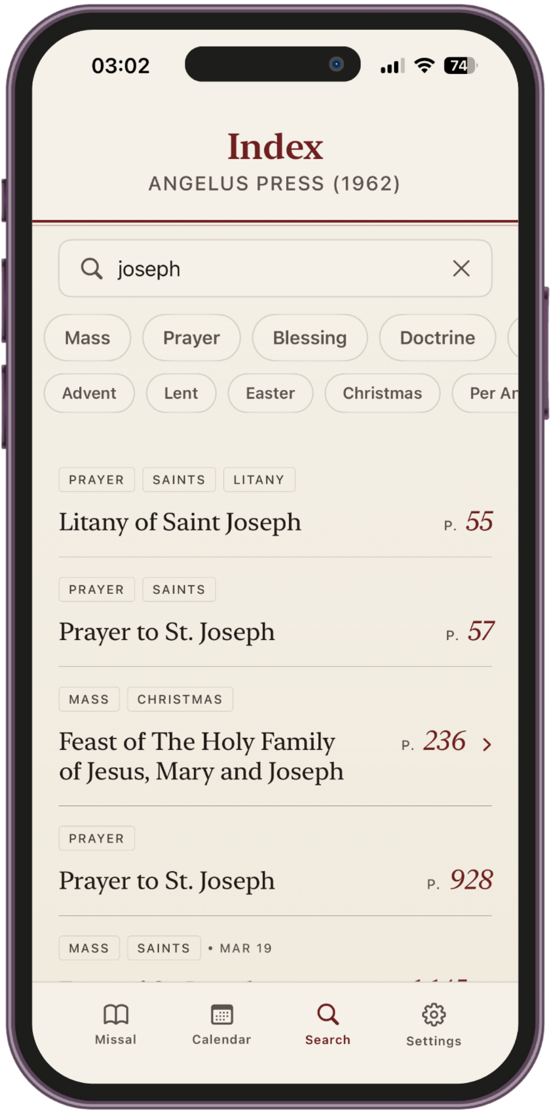 Search your missal faster for prayers, saints, feasts, and Masses. Mass entries are clickable, so you can jump straight to the relevant calendar date.