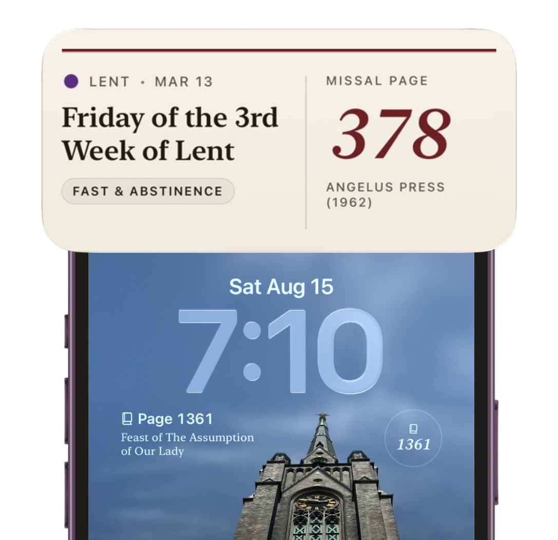 Widgets keep the day's page, feast, and calendar context visible at a glance when you are heading to Mass or planning ahead.